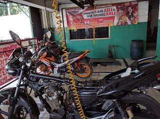 Dan mulailah perjalanan pulang... sudah selesai ? tidak, masalah yang lebih besar timbul! Si Tigor di gas gak mau turun, cepat naik ke 7000 tapi lama sekali turunnya. Kembali lah saya ke bengkel, nunggu sejam karena ada yang lain yang dah ngantri, dan akhirnya saya harus pulang naik busway karena si Togor diwajibkan rawat inap. Sampai hari Selasa masih belum betul juga, dah diisolasi masalahnya di karburator, tapi kok si mekanik ngulang lagi buka tutup blok magnit dan rantai keteng dilepas pasang terus. Duh ni mekanik kayaknya logika nya gak nyampe nih. Ya sudah dimaklumi aja, mungkin dia tipe yang belajar dari pengalaman. Hari Rabu saya bawa karburator dapat beli lewat toko online, ternyata masalahnya sama, akhirnya si mekanik beli karburator seken 1 lagi buat diambil sparepart nya dan dipasang ke karbu 1 nya. Masalah selesai, si Tigor terlihat sehat, lho kok mekanik 1 nya nunjuk nunjuk ke bawah si Tigor? Eh si Tigor ngompol! Bensinnya bocor, nasib nasib. Dicoba dibelikan pelampung, sama saja masih bocor. Kata si mekanik "mas, biarin aja, ntar kalau dah lama ntar baik sendiri, itu pelampung nya baru belum biasa aja". Ya udah manut aja, lha abis libur lebaran kok masih ngompol...